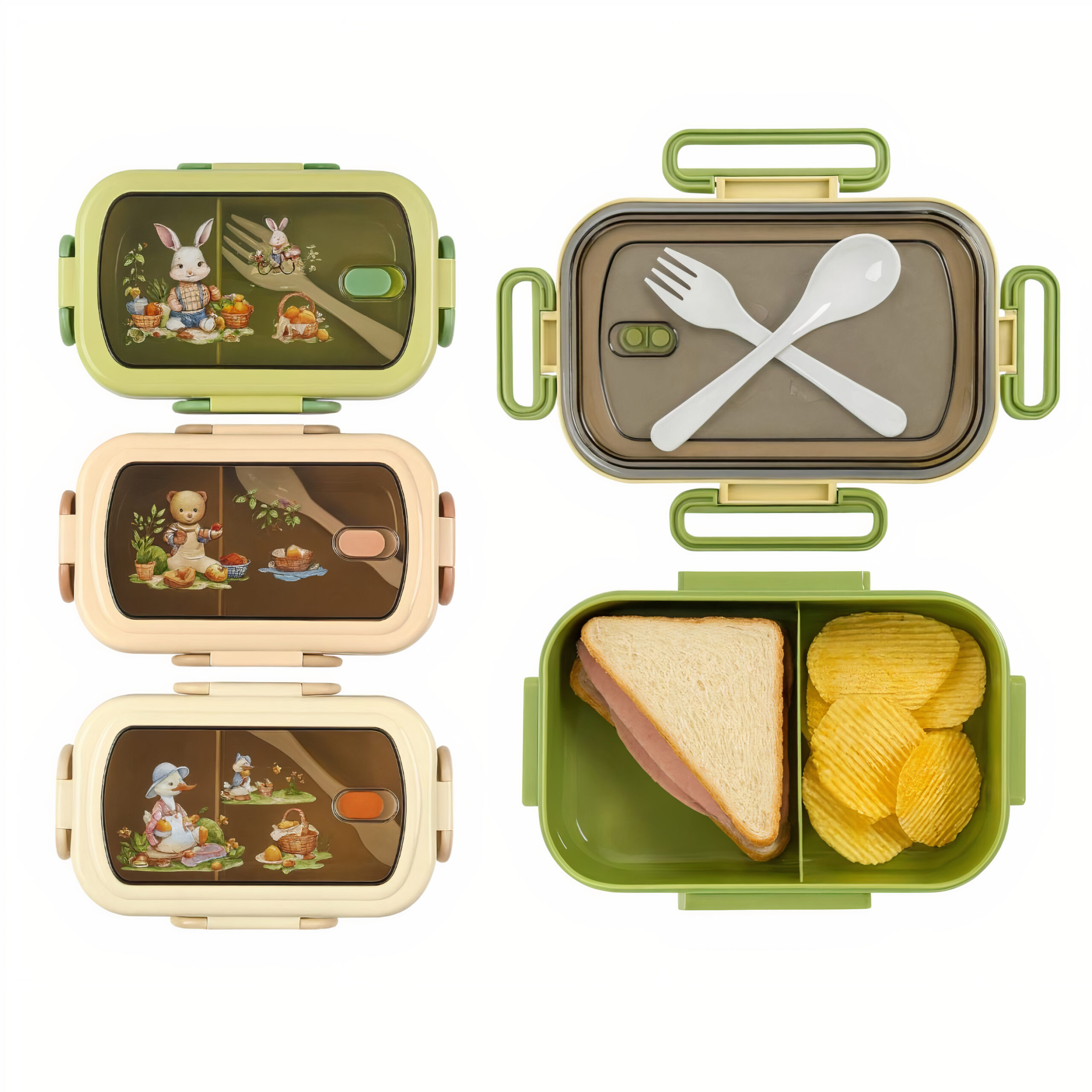Modelul este prevăzut cu două compartimente bine delimitate, special concepute pentru a menține alimentele separate, proaspete și ușor de consumat. Compartimentele permit organizarea eficientă a pachețelului, astfel încât părinții pot pregăti gustări variate precum fructe, legume, sandvișuri, biscuiți, cereale, nuci sau alte alimente potrivite pentru dieta copilului. Separarea ingredientelor este extrem de utilă pentru copiii care preferă ca mâncarea să nu se amestece sau să-și păstreze textura originală. Prin designul intern bine gândit, caserola își menține structura fără a se deplasa sau desface accidental în timpul transportului.